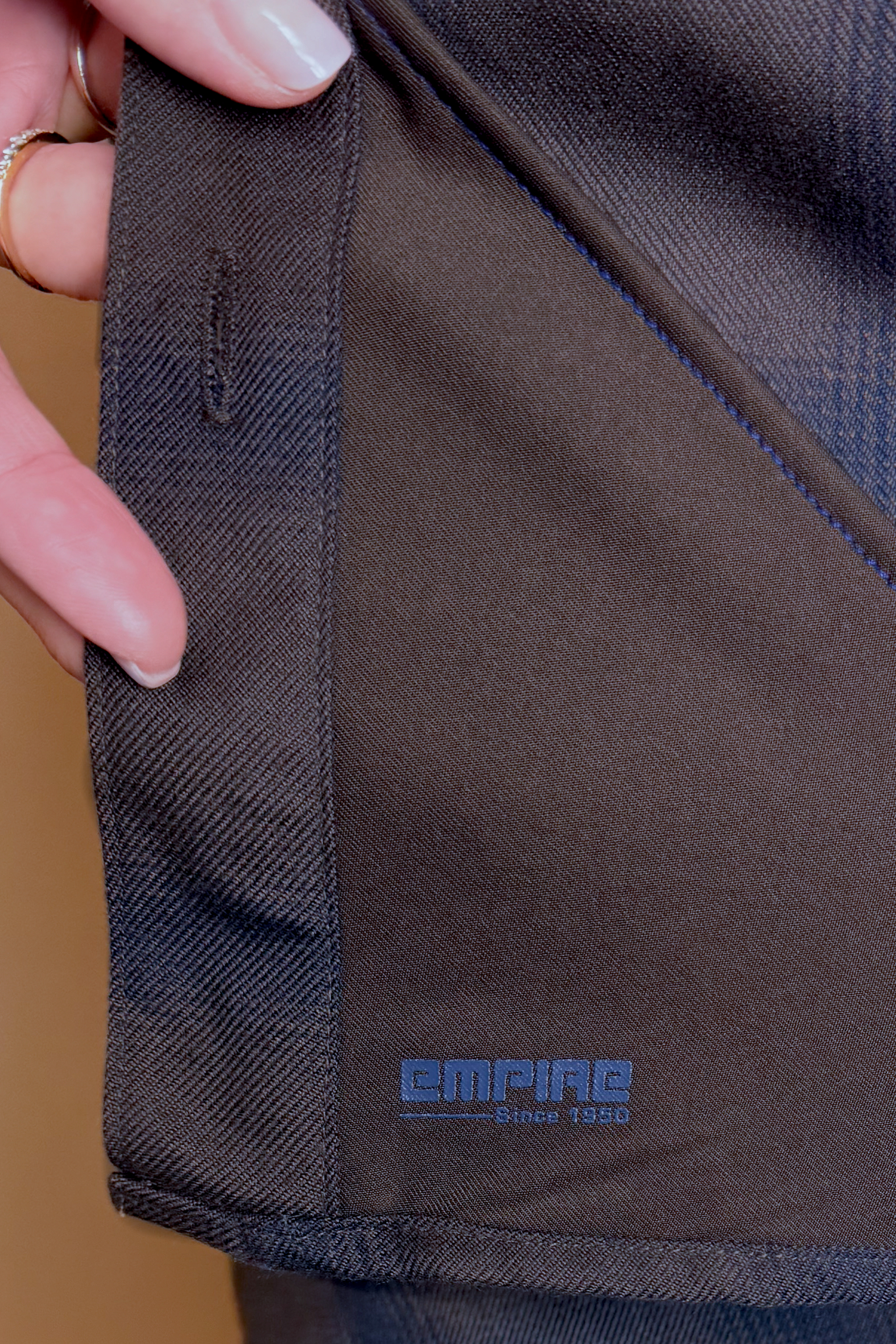 - Brown and blue Empire brand tag on the left chest pocket